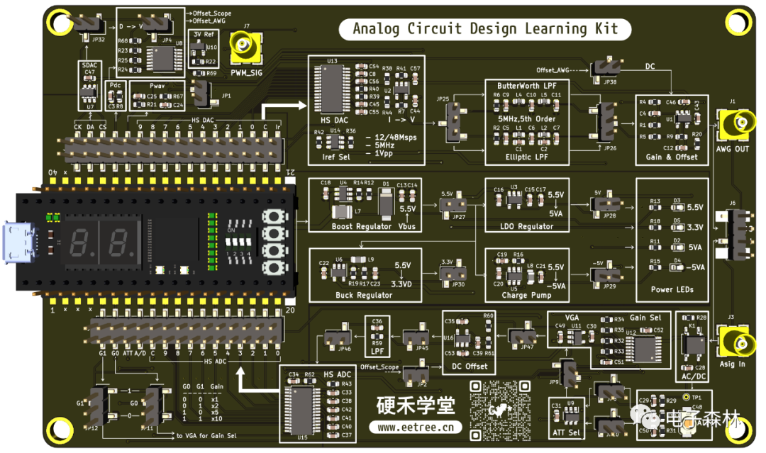 当前,FPGA的学习板基本都是数字系统的 - 搭配按键、显示屏、传感器,做点逻辑控制、显示、网络、数字信号处理等方面的编程等。很少看到数字 + 模拟混合在一起的综合系统学习套件。 对于渴望学习模拟电路的同学、工程师来讲,只是做一些独立模块的设计、测试而学习和掌握到的知识点都是支离破碎的。无系统、不模拟!只有在一个综合性的系统应用中,才能深刻理解模拟电路的精髓。 为此,我们专为小脚丫FPGA核心板设计了一款几乎包含了所有主要模拟器件功能的“模拟电路设计学习套件”,以高速信号发生器和高速数据采集为