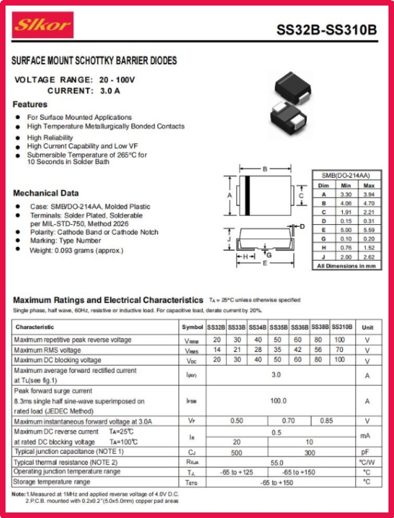 公海555000JC线路检测中心Slkor肖特基二极管SS310B规格书