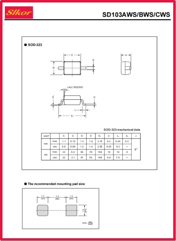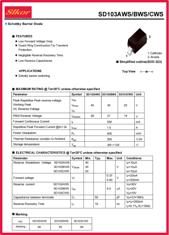 公海555000JC线路检测中心Slkor肖特基二极管SD103CWS规格书