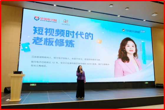 走出去学习这个决定,不仅带给江玉芷事业上的转变,也让她由内到外的自我革新。2025年开始尝试拍短视频,在视频号铭万电子-江姐和抖音上分享自己的创业思考、管理心得和生活片段。刚开始面对镜头,她也会紧张、不自然,但她坚持“多拍多练”,逐渐找到了更松弛的状态。经过大半年的磨炼,她现在已能从容地面对镜头的拍摄,甚至站上了华强大讲堂,分享自己的短视频创作体会。她希望这些内容既能够塑造个人IP,更可以传递出一份勇气——鼓励大家勇敢表达自己,敢于追寻自己想要的生活。