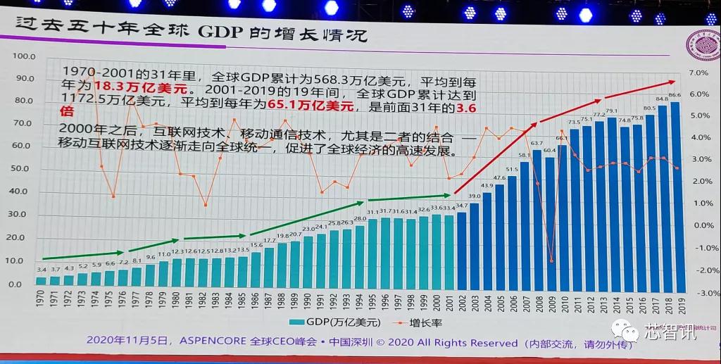 从上图的数据当中,我们可以看到,1970-2001的31年里,全球GDP累计为568.3万亿美元,平均每年为18.3万亿美元。而2001-2019的19年间,全球GDP累计达到1172.5万亿美元,平均到每年为65.1万亿美元,是前面31年的3.6倍。
