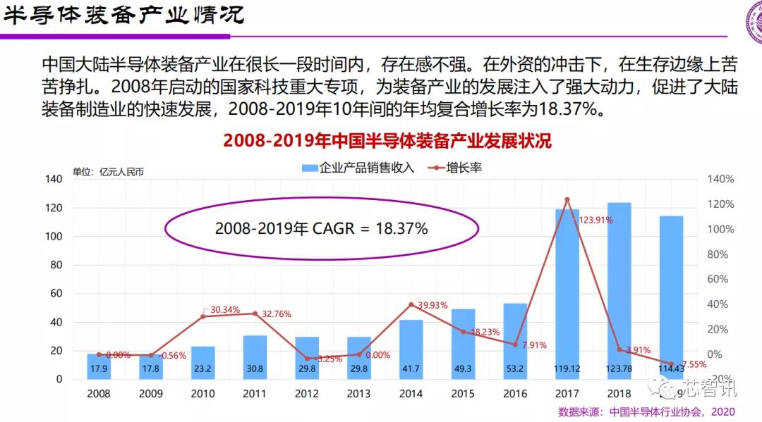 另外,在芯片制造上游的半导体装备产业方面,中国大陆半导体装备产业在很长一段时间内, 存在感不强。在外资的冲击下,在生存边缘上苦苦挣扎。2008年启动的国家科技重大专项,为装备产业的发展注入了强大动力,再加上近几年的国家大基金的支持以及科创板的推出,促进了大陆半导体装备业的快速发展,2008-2019年10年间的年均复合增长率为18.37%。可以明显的看到2017年的增长高达123.91%。