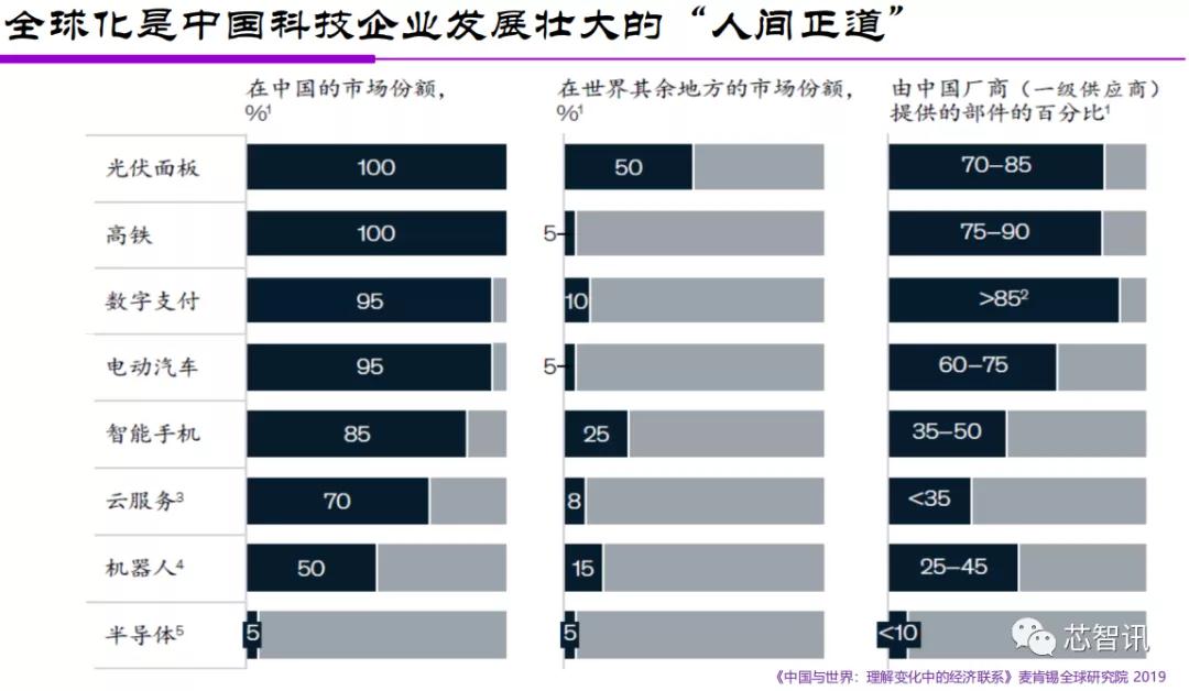 根据麦肯锡全球研究院的一组研究数据显示,在例如电子元件、电动汽车、消费电子及互联网、机器人设备、人工智能、下一代技术等众多关键技术方面,中国对外的依存度依旧很高。从下图当中,我们可以看到,在众多技术方面,中国采用全球标准的比例非常的高,虽然拥有国内供应商的比例也相对较高,但是中国供应商可以在技术上提供全球领导者或可以与之媲美的比例却非常低。这也意味着,很多技术的创新的源头并不在中国,中国需要继续与全球进行技术交流。