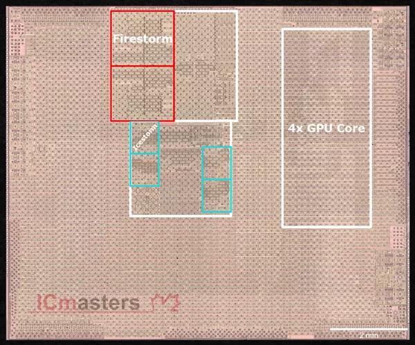 另外,显微观察可以清楚地看到A14里的六个CPU核心,包括两个大核心FireStorm、三个小核心IceStorm,以及四个GPU核心、16个神经引擎核心。