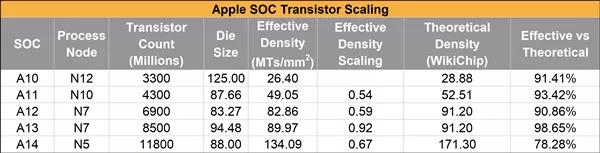 当然,这并不是说台积电5nm工艺不行,而是不同芯片有着不同的逻辑电路、缓存布局和设计,但是就实际值与理论值的对比看,这次确实低了很多,前几代可是全部超过90%,A13甚至达到了惊人的98.65%。