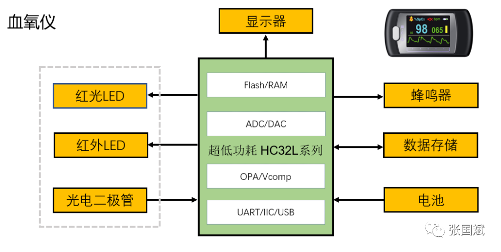 据介绍,华大血氧仪通过检测充血人体末梢组织,对不同波长的红光和红外光的吸光度变化率之比推算组织的动脉血氧饱和度。方案是基于华大半导体自主研发的HC32L系列超低功耗MCU芯片产品,具有高整合度、高抗干扰、高可靠性和超低功耗的特点,HC32L系列芯片产品采用Cortex-M0+内核,集成丰富的外设功能,包括各种定时器、LCD控制器、ADC/DAC、Vcomp比较器、OPA运放等,以及UART、SPI、I2C等多种通讯接口,特别适用于额温枪、血氧仪等相关便携式医疗电子设备。