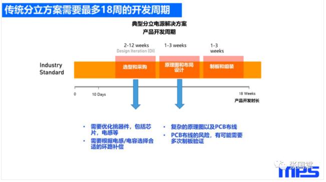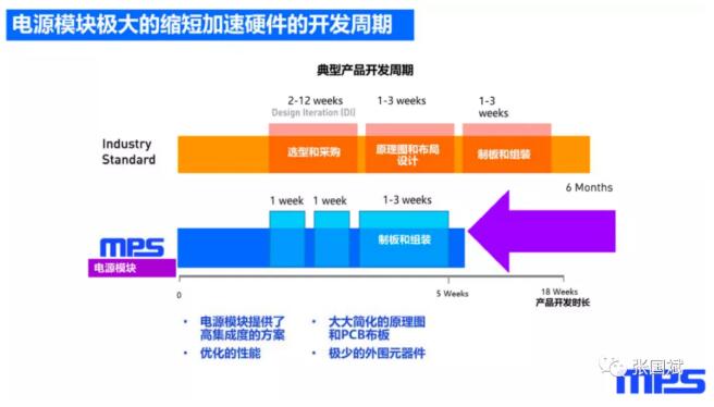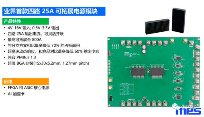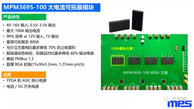 “为了满足这种要求,我们MPS的产品使用了基于COT的控制架构,在这种多相并联的应用下我们使用的是Multi-Phase,就是多相的COT,它可以在这种大动态的环境下去实时调节开关频率,所以在这种应用环境下是非常有优势的。”他强调。   关于上文提到的电源迅捷趋势他指出对于电源的研发周期需要尽可能的短,由于不同加速应用越来越多,很大程度上,这种加速卡是基于应用来优化和设计的,假如说加速卡厂家不能及时地推出新设计,那么它就有可能错过某一个应用,所以这就对加速卡厂商研发的时间提出了非常高的要求。     而电源产品在这个加速卡研发过程中实际上是占有时间较多,对于传统的分立电源解决方案,要从选型和采购开始,就需要挑选各种器件,包括芯片,包括产品的驱动芯片还有功率管,还需要需要根据不同的电感/电容选择合适的环路补偿,这非常耗时。而且原理图和布局设计也是比较复杂,同时由于有比较复杂的PCB源布线和原理图,那么就会有可能出现风险,出现多次制板的验证。     “我们电源模块的解决方案呢,极大地缩短了这种加速硬件的开发周期。大家可以看到,我们可以在1周内把选型、采购还有原理图设计在2周内全部都完成,然后去制板和组装。这个是由于我们的电源模块做了高程度的集成和优化,那么客户上板以后就不需要再做额外的优化采购的动作,也大大地简化了它的原理图和PCB布线。所以说可以把开发周期极大地缩短。”他指出。“这对于加速厂商来讲,是非常重要的去应对新的加速应用的环境。”        MPS针对加速卡推出的大电流电源模块        基于这样的趋势,MPS推出了瞄准加速卡应用的电源模块,以MPM3695-100 大电流可拓展模块为例,它的主要特点是 支持4V-16V 输入; 0.5V-3.3V 输出,它可以支持最大 100A 的输出电流。该解决方案非常紧凑。把功率管控制IC,以及一些被动元件电感电阻全都集成在15x30mmBGA封装中,外围器件很少。