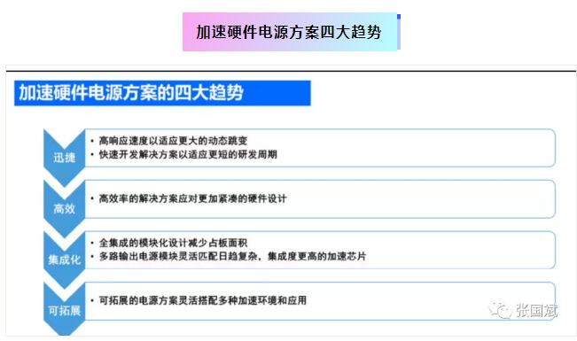 1、迅捷、高效、集成化、可拓展。那么其中迅捷就包括了两点:第一个是说电源解决方案需要有更高的响应速度以适应更大的动态跳变,同时整个电源的解决方案的开发的速度应该非常快以适应更短的加速硬件的研发周期。   2、高效率解决解决方案---即电源方案商需要提供高效率的解决方案,以应对更加紧凑的硬件设计。   3、集成化---由于加速卡的设计非常的紧凑,意味着它的密度会越来越高,就需要厂商提供全集成的模块化设计,这种集成化的模设计就可以极大程度地减少在客户板上的占板面积。这样客户就有更多的板面积可以用作其他的功能,比如说内存、HBM(High‐bandwidth Memory )等,此外,集成化模块还要提供多路输出电源,就是在同一个封装内加入多个输出,这种多路输出会灵活地匹配日趋复杂,集成度更高的加速芯片。   4、可拓展--可拓展的电源方案可以更灵活搭配 多种加速环境和应用,因为数据和人工智能是在一个加速发展过程中,在这种过程当中会涌现出一批之前完全没有出现过的应用,所以说电源解决方案需要足够灵活,可以迅速地适配这种全新的之前没有出现过的应用。