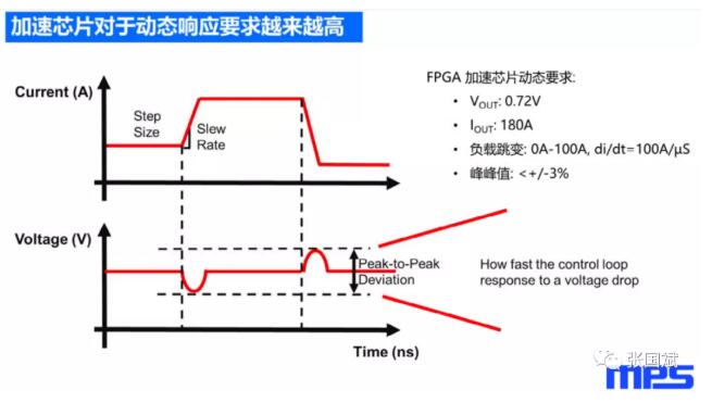 的要求则越来越低。同时由于加速芯片厂商为了提供更复杂功能的加速芯片,提供更完善的功能给他们的客户应用在加速卡的场景当中,在应用更先进的工艺的同时,他们也集成了更多的功能单元,如除了加速逻辑单元以外,他们会集成RM处理器以及DSP。然后他们还会加入这种专门优化过的加速引擎。那么这种越来越高的集成化就会造成针对加速芯片的电源解决方案会越来越复杂,就是它需要不同电压、不同路的多路的输入,就是电压轨会越来越多。然后还有一个趋势就是由于各种各样不同的加速应用,为了应对这些不同的加速的应用,首先这些加速芯片的厂商会在同一个系列下的芯片,它会针对不同的应用做出不同的优化,这种优化就会造成加速芯片的电压轨和输入的电流各不相同(和应用是相关的);另外一点,即便是同一款加速芯片,它在不同应用场合使用到的内部的逻辑资源也是不同的,比方说在某一些应用,同一款加速芯片可能会占用到内部80%的资源,那么它对核供电的电流的要求就基本要求100%,比方说它的满载是120A,那么它可能就需要用到120A。那么在另外一些场合,对于这种加速芯片的逻辑单元就不那么高,那么可能会用到50%的逻辑芯片,那么这样对于核供电的电流要求也会下降,比方说120A的满载,它可能会用到50A,60A。所以说,随着应用的不同,电源解决方案的电压轨的数量,还有电流也是个各不相同的。   他表示另外一个趋势就是:大动态,这种大动态是随着应用调用资源相关的。如下图所示:     这是一个典型的加速芯片对于输入电流和输入电压的要求和波形。典型的输入电压是0.72V,它需要的满载电流是180A。为了满足这个应用环境当中对于资源的调用,就要求负载跳变需要 0A-100A, 这是一个很大的动态,这里说的0-100A是步长;同时呢,它的di/dt(上升沿)也是一个非常快的速率,因为这个速率取决于逻辑单元调用(打开)的速率,假如说它从时间点1到时   间点2,迅速从这个资源要增加逻辑门资源的调用,那么它的Slew Rate就非常得快,所以就造成了FPGA这种内核供电对大动态的要求。在这种大动态电流要求的背景下,输出电压还要不能出现太大的波动,典型的峰峰值应该要求的是<+/-3%。