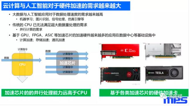“过去几年,大数据与人工智能产业高速发展,激发了一大批基于大数据与人工智能的应用,如机器学习、图片识别、信号处理,仿真引擎等等。这些应用的出现,对数据中心以及云计算相关的基础架构提出了更高的要求,因为这些新的应用会提出超级大的数据量需求。”5月14日,在MPS新品发布会上,MPS大电流模块产品经理杨恒指出,“传统的基于 CPU 的软件的处理和加速,已经无法满足新型基于人工智能和大数据的应用,所以出现了很多基于GPU、FPGA,ASIC 等这种加速芯片的加速硬件。加速芯片可以提供不少于20倍的加速能力,现在越来越多的数据中心会应用基于加速芯片的硬件加速卡,这些加速卡基本上分为三类:计算加速;存储加速;通讯加速。基本上在数据处理的整个环节都有加速的应用。各大加速芯片制造商也推出了各种基于他们自家芯片的硬件加速卡。如赛灵思就推出了ALVEO系列,应用于数据中心的各个领域,他们还会推出应用在不同领域的加速卡如通信类、金融类等等。随着加速卡的越来越广泛应用,也给电源设计方案提出了更多的挑战!”          加速硬件电源方案四大趋势           他表示加速硬件对于电源方案需求趋势可以总结为四点: