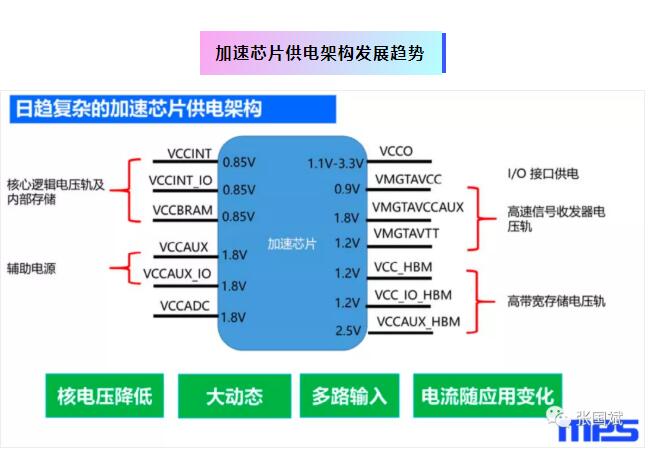 加速芯片供电架构发展趋势           另外,加速芯片的供电架构也在发生 变化,由于加速硬件在人工智能和大数据领域应用越来越广泛,所以各大加速芯片厂家也都纷纷用更先进的工艺推出了集成度更高的加速芯片。就以FPGA为例,几年前看到的FPGA的工艺制程是28nm,然后他们迅速推广到了16nm,现在最新一代的专门针对加速卡市场推出的加速芯片,已经用到了最先进的7nm制程。这种更先进的制程就可以使它在同样的尺寸内加入更多的逻辑单元,同时由于加入了更多的逻辑单元,会使芯片的整体功率越来越大。另外,由于更先进制程的使用,对于内核电压