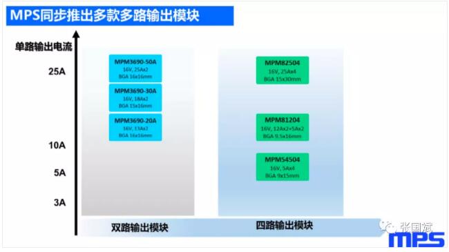 “我们可以使用同一个设计,把设计应用在不同的加速卡上面,可以快速 地去升级不同的应用,所以这个也是进一步灵活地去匹配这个加速卡硬件厂商对 于不同场景的应用。”杨恒指出,“它的另外一个优势就是通过这种高集成化多路输出的电源模块,可以极大改善客户在加速硬件板卡上的占板面积。可以看下首先右边是一个典型的加速芯片的电源架构,那么它一共需要8路输入电源,那么这8路的输入电源假如使用分立的方案,我至少需要6个分立的解决方案,因为这3个0.85V是可以并联在一起的,我需要至少使用6路不同的电源解决的IC。那么使用82504,我们可以通过高集成多路输出的电源模块把它8路输入的电压轨集成在2个模块当中。”     可以看一下左边这个图,上面是分立的解决方案,需要占很大的占板空间,下面这个图是应用82504的示意图,可以看到通过这种高集成性,可以把之前很大的占板空间缩小到2个82504的尺寸,这样就帮客户进一步降低了占板面积。     他表示这种多路输出在加速卡应用的场景非常有优势,客户接受度非常高,一因此MPS同步推出了多款多路输出的电源模块。在多路输出的电源模块的系列当中,分为双路输出和四路输出,双路输出推出了3款产品:3690-20A、3690-30A还有3690-50A,这3个产品是Pin-to-Pin 的,分别提供了双路13A、双路18A和双路25A的输出能力。右边是4路输出的电源模块,我们这回3款新品,电流从低到高是MPM54504是四路5A的电源模块,MPM81204这个电源模块是双路12A+双路5A;MPM82504是4路25A。