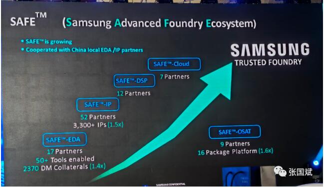 X-Cube的全称是eXtended-Cube,意为拓展的立方体。在Die之间的互联上面,它使用的是成熟的TSV工艺,即硅穿孔工艺。目前三星自己的X-Cube测试芯片已经能够做到将SRAM层堆叠在逻辑层之上,通过TSV进行互联,制程是他们自家的7nm EUV工艺。三星表示这样可以将SRAM与逻辑部分分离,更易于扩展SRAM的容量。另外,3D封装缩短了Die之间的信号距离,能够提升数据传输速度并提高能效。 X-Cube可灵活应用于未来芯片之上,包括5G、AI和高性能计算等领域的芯片均可使用该技术。三星表示X-Cube已经在自家的7nm和5nm制程上面通过了验证,计划和无晶圆厂的芯片设计公司继续合作,推进3D封装工艺在下一代高性能应用中的部署。这个短视频介绍了这个技术。 三星也有自己的高级代工生态计划(SAFE)如在SAFE EDA领域,三星有12个合作伙伴,在SAFE IP 领域,三星有52个合作伙伴。