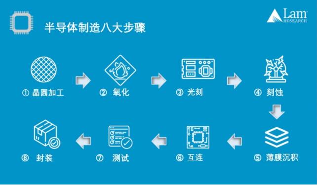 每个半导体产品的制造都需要数百个工艺,泛林集团将整个制造过程分为八个步骤:晶圆加工-氧化-光刻-刻蚀-薄膜沉积-互连-测试-封装。
