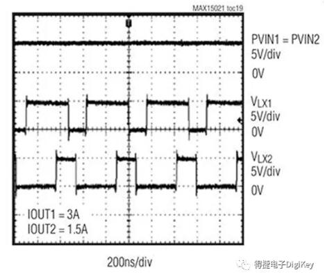 图5:MAX15021双通道稳压器可实现180°异相工作以抑制EMI。(图片来源:Maxim Integrated)