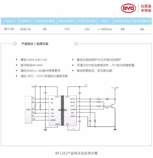 近期,比亚迪半导体基于先前研发成果的稳固基础上,继续整合自身优势,成功自主研发并量产1200V功率器件驱动芯片——BF1181,今年12月实现向各大厂商批量供货。
