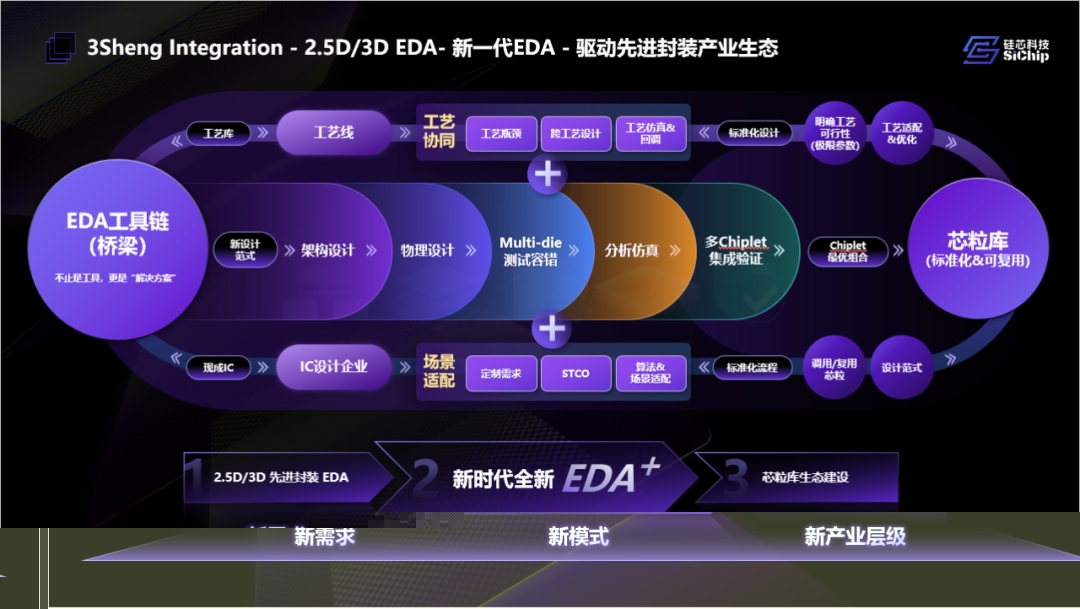 从硅芯科技在会上披露的思路来看,EDA+可以概括为一条完整链路:以“2.5D/3D 全流程先进封装 EDA 工具链”为桥梁,一端深度对接工艺协同,另一端面向多 Chiplet 集成验证的应用场景,实现从系统架构规划、物理实现、多物理场仿真到制造验证的工程闭环。EDA⁺不是一套“软件产品组合”,而是一种面向 Chiplet 与 3DIC 的新设计范式。