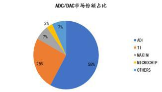 目前国际上ADC/DAC市场份额分别被ADI、TI、MAXIM、MICROCHIP等国外企业独占,其中,ADI市占率约为58%,TI占比约为25%,MAXIM占7%,MICROCHIP占3%,难觅国内企业身影。