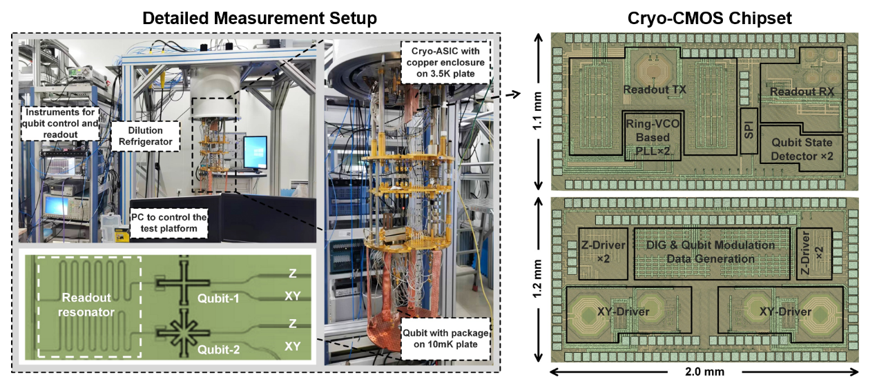 随着规模化量子计算研究的不断深入,可在超低温环境下有效工作的量子比特操控与读出芯片被认为是实现规模化实用量子计算机的关键支撑技术。该项技术的核心挑战是在有限的制冷功率条件下提升量子比特接口芯片的可操控和读出通道数,推动实现量子比特的大规模集成。为攻克这一技术难题,推进量子计算机小型化和集成度,研究并突破超低功耗的量子比特接口芯片设计技术具有重大意义。研究团队在前期CMOS工艺超低温特性建模、高集成度量子比特控制芯片等研究基础之上,设计出极低功耗的双量子比特接口芯片组(含完整操控与读出)。该芯片组基于相位域信号处理的极化调制和反射读出技术,在3.5K低温环境下可以产生双超导量子比特控制、读出所需的XY通道任意包络脉冲信号、Z通道偏置信号和反射读出激励信号,实现了基于相位信息的量子比特状态检测电路,同时片上集成了时钟产生、指令存储等电路,芯片组功耗相对于国际上同类研究大幅降低。该芯片在北京量子信息科学研究院量子计算云平台实现了对超导量子比特的有效控制及状态读出。该工作以“A Cryo-CMOS Quantum Computing Unit Interface Chipset in 28nm Bulk CMOS with Phase-Detection based Readout and Phase-Shifter based Pulse Generation”为题发表在ISSCC‘24。论文第一作者为郭衍束博士,团队的姜汉钧副教授、李铁夫副研究员为该项研究工作的主要负责人。