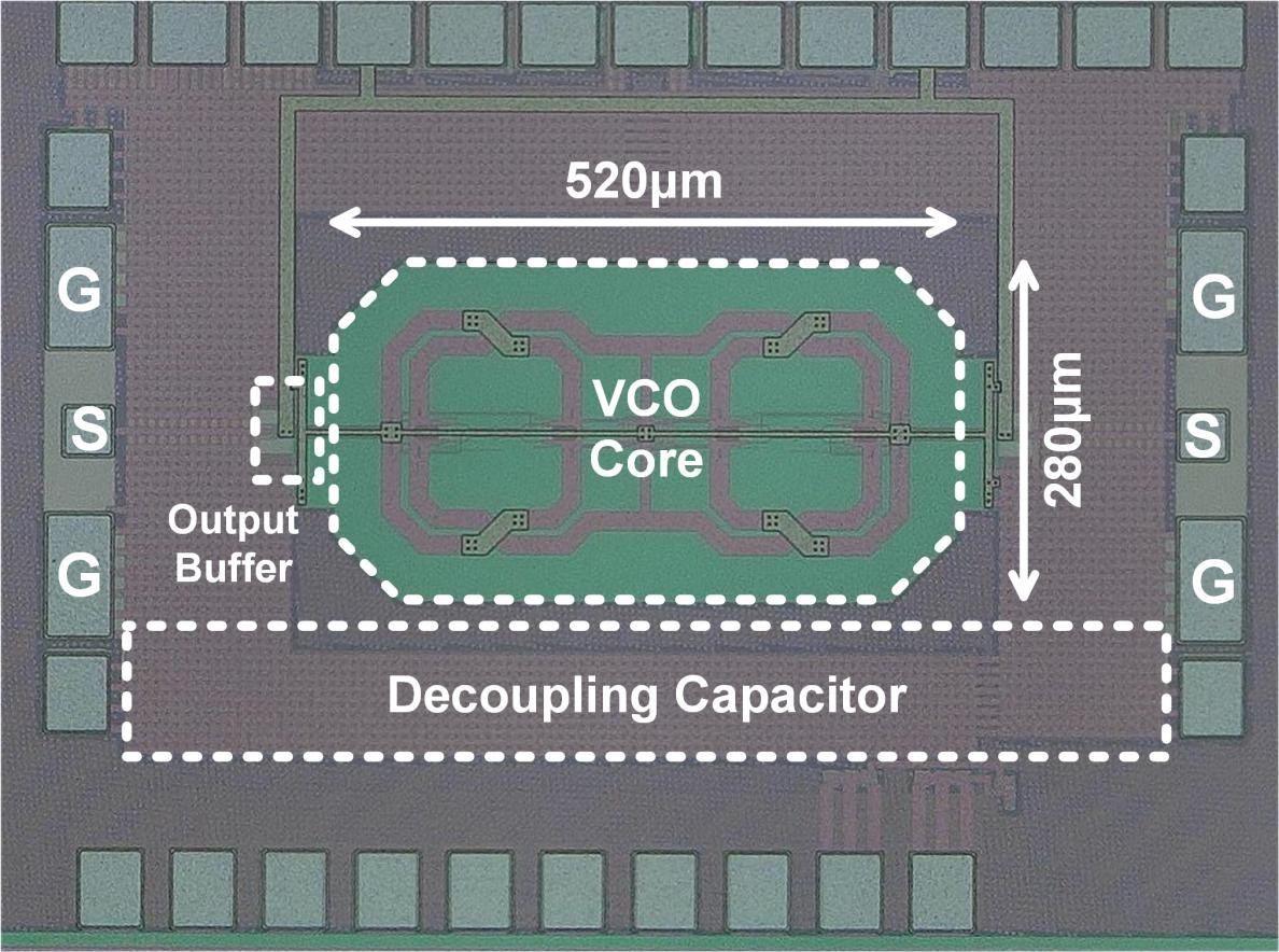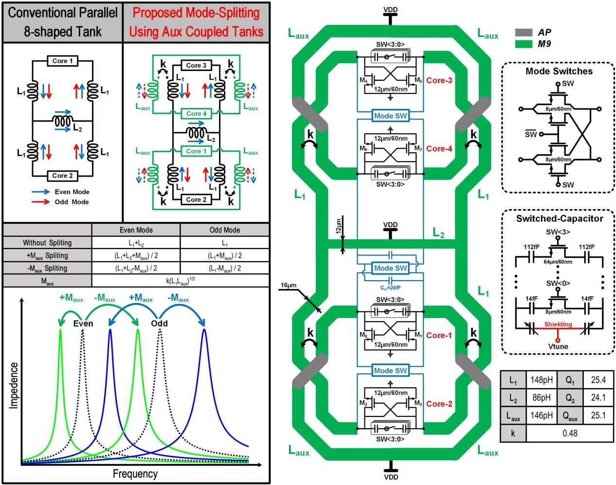 应用于射频收发前端的宽带毫米波频段的本地振荡器对于5G通信技术的毫米波应用以及高性能雷达技术有着重要意义。目前文献中所报导的高性能振荡器大多带宽有限,无法应用于宽带的通信系统中;同时,既有的宽带振荡器又存在相位噪声随带宽增加而恶化严重的问题。以此为出发点,研究团队提出了一种基于“模式分裂”技术的多模多核超宽带射频压控振荡器。该技术在传统的双核双模的“8”字型电感拓扑结构的基础上,通过引入一对对称的辅助谐振腔与主谐振腔产生同相或反相磁场耦合,不仅产生了四种等效电感,从而将原有的两种模式分裂成了四种模式,极大地扩展了振荡器的带宽,而且在不增加面积的情况下额外引入了两个核心,相比于传统的单核结构降低了6dB的相位噪声。所提出的多模多核宽带振荡器可以覆盖13.7至41.5GHz的基频范围,即101%的分数带宽,同时在10MHz处频偏处的峰值FoM及FoMT分别达到了194.0至214.1dBc/Hz。值得说明的是,该芯片是第一颗同时达到100%以上分数带宽及高于210dBc/Hz FoMT的宽带振荡器,具有世界领先的性能。该工作以“A 13.7-to-41.5GHz 214.1dBc/Hz FoMT Quad-Core Quad-Mode VCO Using an Oscillation-Mode-Splitting Technique”为题发表在ISSCC’24。集成电路学院本科生葛桓羽为论文第一作者,团队的贾海昆副教授为论文通讯作者。