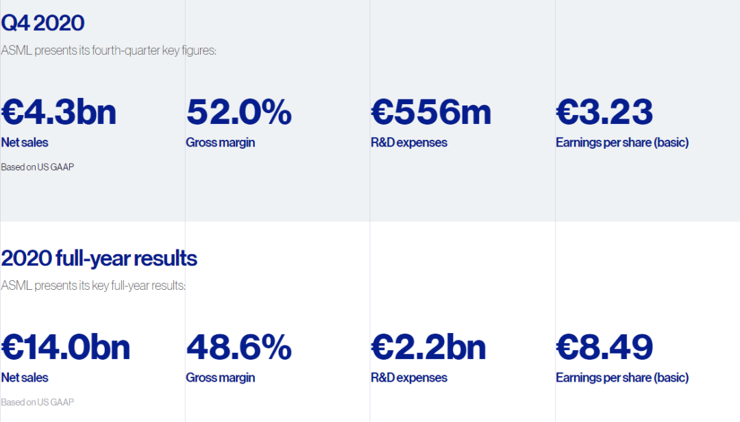 1月20日,ASML召开了2020第四季度和全年财报电话会议,ASML总裁兼首席执行官Peter Wennink在会上透露,ASML第四季度销售额为43亿欧元,2020年全年净销售总额为140亿欧元(约合170.45亿美元)。