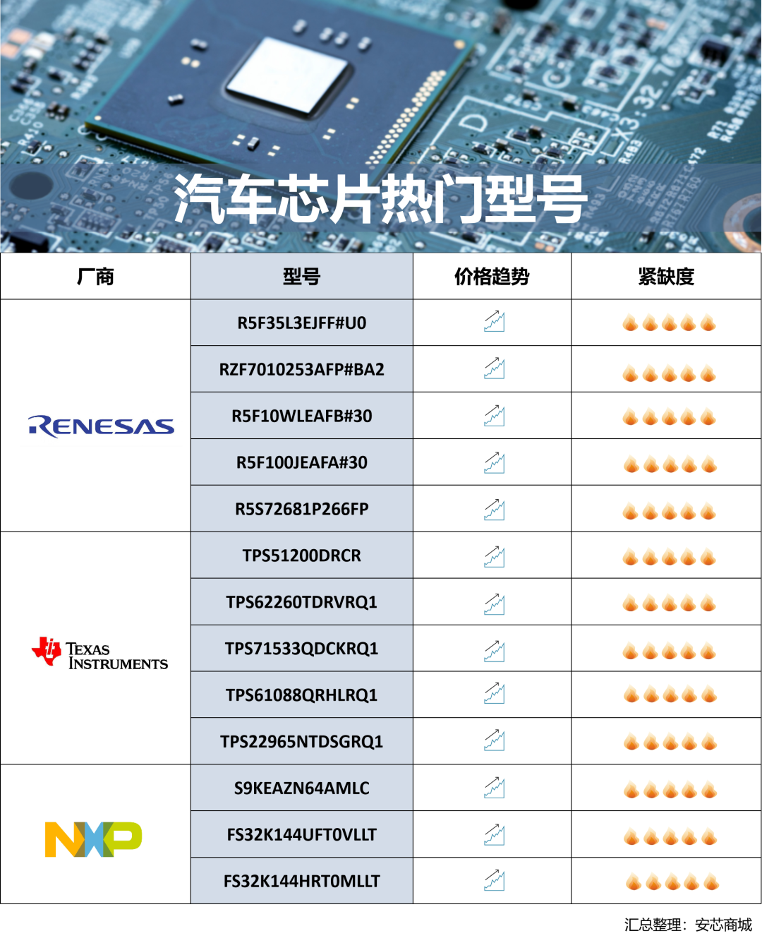 因此,安芯商城整理了一份汽车芯片产业链厂商汇总及近期热门型号数据,供伙伴们参考。