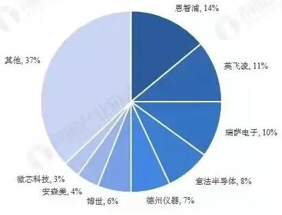 主要厂商:恩智浦、英飞凌、瑞萨电子、意法半导体、德州仪器、博世、安森美、微芯科技,占据全球63%的汽车芯片市场。