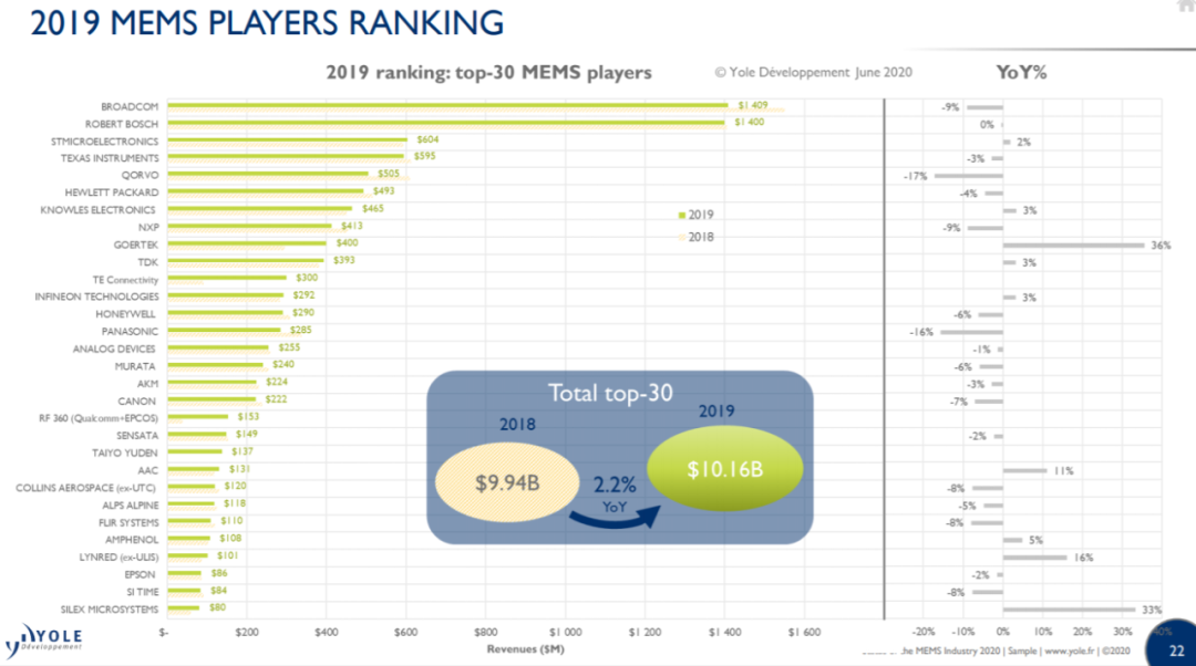 2019年MEMS厂家的销售额排名TOP30,(单位:百万美元)(图片出自:Yole Développement)