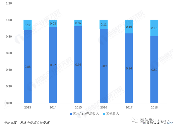 公司主营业为为LED芯片业务,2013-2018年,公司LED、芯片产品收入均占比公司全部营业收入的80%以上,2015年公司LED、芯片业务占比达到了93%。近年来,公司加快LED产业链的垂直一体化布局,产品由原来单一的外延片及芯片逐步向上游原材料(衬底、气体)和下游高端LED应用产品拓展,完善全产业链生产,公司LED芯片产品占比逐渐下降,材料收入占比逐渐上升,打造LED芯片全产业链布局。2018年,公司芯片及LED产品收入67.33亿元,较上年同比下降4.43%;材料、废料销售收入14.19亿元,较上年同比上升42.67%。