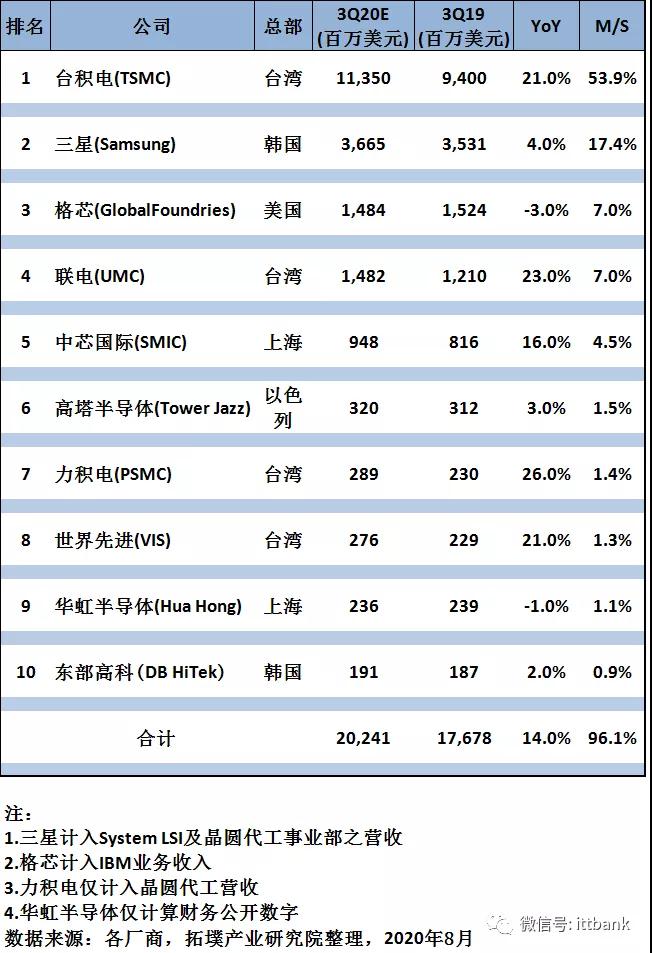 2020年第三季度全球前十大晶圆代工厂营收预测排名