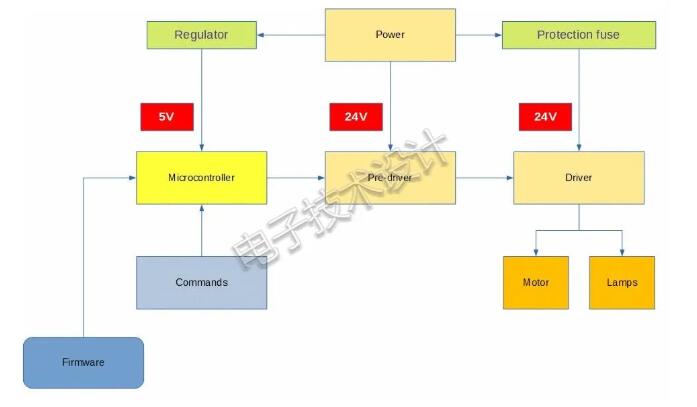 图2给出了该系统的框图。MCU管理逻辑操作并接收操作员下发的命令。它还能产生PWM(小功率)信号而驱动预驱动器。后者将电流信号放大并将其传递给驱动器,进而控制负载。