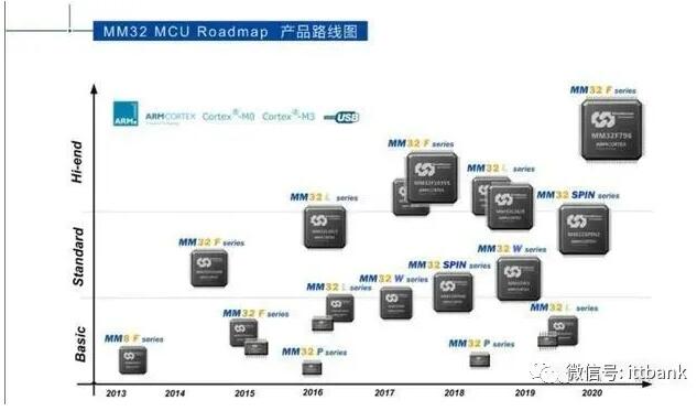 MM32系列基于ARM Cortex-M0及Cortex-M3 内核,产品包括:针对通用高性能市场的MM32F系列,针对超低功耗及安全应用的MM32L系列,具有多种无线连接功能的MM32W系列,电机驱动及控制专用的MM32SPIN系列,以及OTP型的MM32P系列等,同样的管脚、型号等与ST全兼容,替换成本非常低。