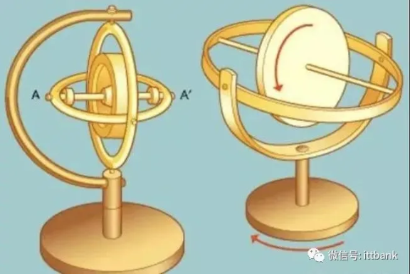 最早的陀螺仪的简易制作方式如下:即将一个高速旋转的陀螺放到一个万向支架上,靠陀螺的方向来计算角速度,简易图如下图所示。