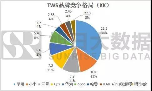 根据旭日大数据发布的2020年品牌出货量竞争格局,在TWS出货量前十玩家中,有五家手机厂商,市场份额占比74%(苹果+安卓),表明手机厂商在未来TWS行业中的角色越来越重要。