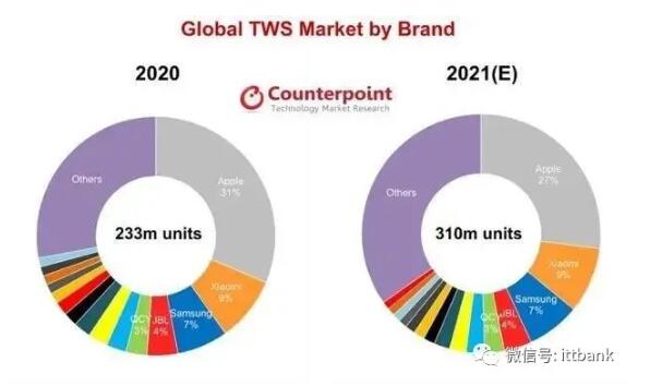 据悉,2021年第二季度,全球个人智能音频市场出货量达9980万台,整体增长4.7%。AirPods TWS设备的出货量在2021年第二季度下降了25.7%,降至1500万台,导致本季度整个TWS市场的增长低于往常。