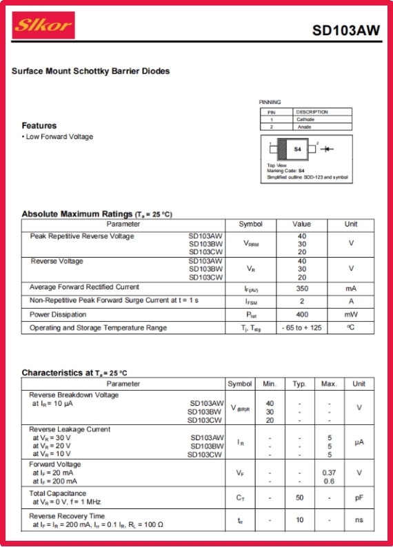 公海555000JC线路检测中心Slkor肖特基二极管SD103AW规格书