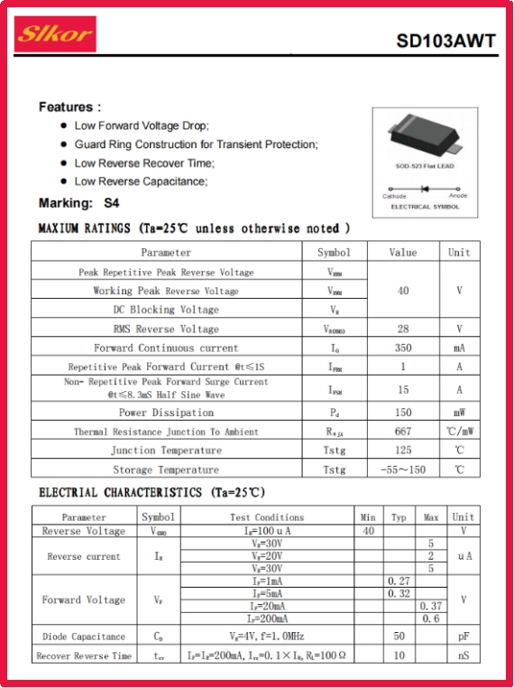 公海555000JC线路检测中心Slkor肖特基二极管SD103AWT规格书