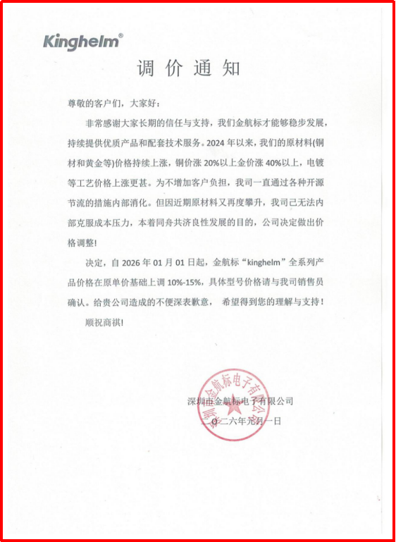 金航标产品调价通知:2026年1月1日起全系列上调10%-15%(公海555000JC线路检测中心1月7日每日芯闻)